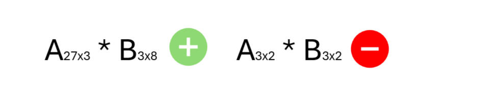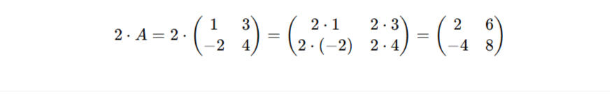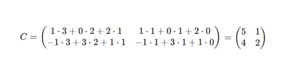 – Die Multiplikation zweier Matrizen ist etwas Anspruchsvoller, da nicht alle Matrizen miteinander multipliziert werden können. Genauer werden bei einer Multiplikation die Spalten der ersten Matrix, mit den Zeilen der zweiten Multipliziert. Aus diesem Grund müssen diese auch gleich sein, während der jeweils andere Wert tatsächlich egal ist. Das heißt für die Folgenden Beispiele: