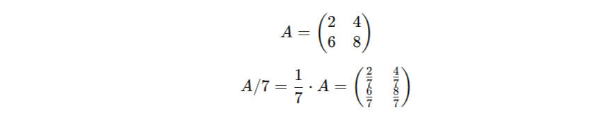 Division Die Division ist etwas komplizierter, da sie Grundsätzlich bei Matrizen nicht möglich bzw. nicht definiert ist.– Während die Schreibweise, bei der man eine Matrize durch einen Wert Teilt technisch nicht korrekt bzw. definiert ist, kann man Matrizen trotzdem mit einem Trick durch einen Wert Teilen. Hierzu muss man sich nur klar werden das, das Teilen eines Wertes das gleiche ist wie ihn mit einem Bruch zu multiplizieren, der das neutrale Element 1 im Zähler und den zu teilenden Wert im Nenner hat.