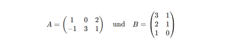 – Im zweiten Fall wiederum sind die Matrizen sogar gleichgroß, da aber die inneren nicht zusammen passen, können sie nicht multipliziert werden.– Um sich schnell einen Eindruck darüber zu machen ob man zwei Matrizen verrechnen kann, kann es also hilfreich sein, die Dimension immer dazu zu schreiben.Nehmen wir nun an wir haben folgende Matrizen gegeben und wollen diese Multiplizieren: